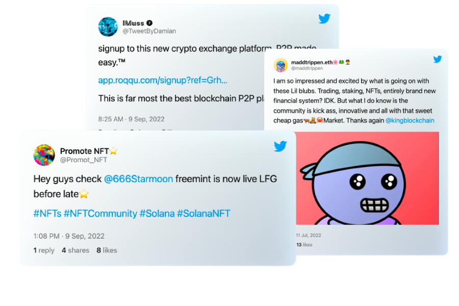 Send us your ad. We'll find the best match for you. One or several of our influencers will promote it on Twitter. Reach millions. Get viral. Simple.